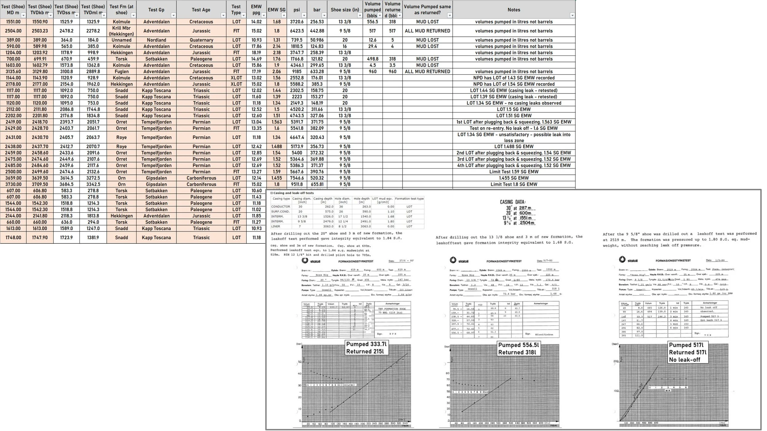 As available in other areas, an Excel database of all extracted LOT and LT data, including test/shoe depth, formation, EMW and calculated pressure (bar), test type, shoe size, and where available test type verified vs mud volumes pumped/returned.